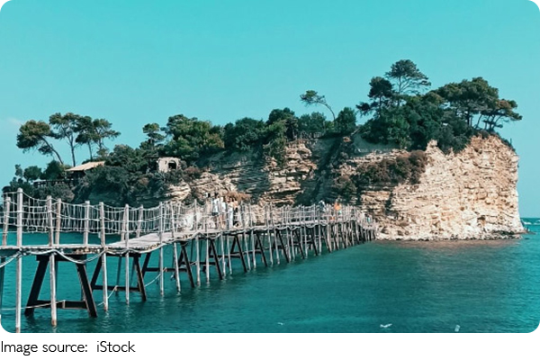 Access: A beautiful wooden footbridge connects the island to Agios Sostis Beach. Walking across the bridge is a unique experience, with the crystal-clear waters of the Ionian Sea below.